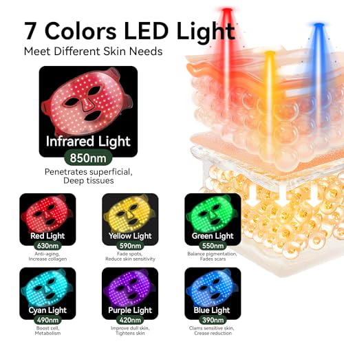 【Upgraded Light Therapy for Face Mask】 LED facial mask upgraded to 7 colors of light, which can emit 7 different wavelength bands suitable for different types of skin. When using it, 420nm-850nm,you can choose the wavelength that suits you.