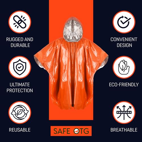 2 Pack Emergency Ponchos: The 2 pack emergency poncho is designed by NASA for space exploration. They are tear-resistant and made of extra thick, strong, durable and reusable insulating Mylar material. Perfect for survival gear and equipment so you can retain 90% of body heat, keeping you warm, dry, and safe. Multi Function: Our wind resistant and waterproof poncho hybrid is the best alternative for emergency blankets because it keeps your hands free but it still gives you of a Mylar blanket. Designed with a hood that keeps valuable body heat from escaping from your head and can be folded down to help regulate your body temperature. Great Size: Each poncho measures 51” x 39” not including the hood. It comes packaged small, compact, and light, making it easy to store in a backpack, bug out bag, survival kit, first aid kit, car and home for your family, friends, children and others. The survival poncho fits most bodies comfortably and you can even fit your backpack underneath it to keep it safe & dry. Many Uses: The orange color ensures high visibility, while the inside silver color offers reflective and heat properties. Its versatile design makes it ideal for your survival kit, survival gear, hiking gear, sleeping bag, earthquake kit, bug out bag, or car emergency kit, so you’re always prepared! Rescue Essential: Perfect for emergency situations where warmth or protection from extreme weather conditions is required. Like sudden weather changes, disasters, earthquakes, rain, snow, hail and windy conditions. These insulated rain poncho make you safe in any weather and prevent hypothermia and shock by retaining up to 90% of the body heat.