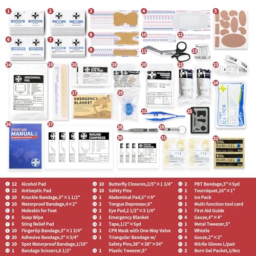 【Contents】Fully packed with 149 pieces first aid treatment products, such as adhesive bandages, gauzes, tourniquet, burn gel, ice pack, etc. It meets international medical standards, suit for minor cuts, scrapes, sprains and burns.