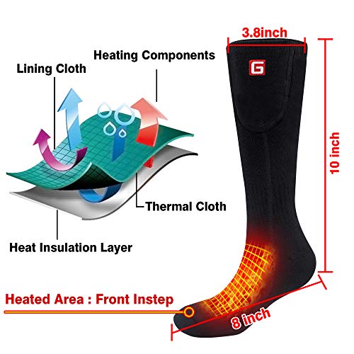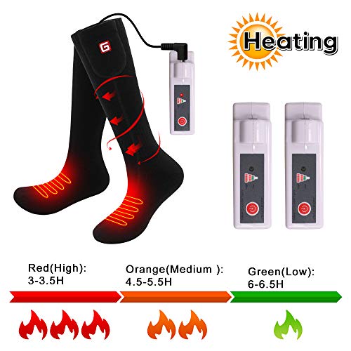 3 Heating levels to be adjustable.With the battery on,High (Red), medium (Orange) and Low (Green), keep your feet from freezing.The heating element for these battery socks are in front instep,provide heat and gradually spread the warmth to cold feet.The winter heated socks heat up fast and get nice and toasty. Walking around in the winter and not having frozen feet.