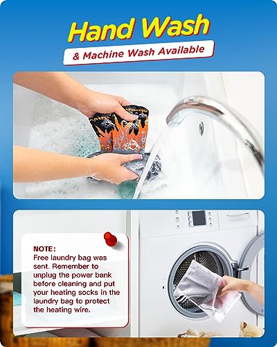 【Machine & Hand Washable Warm Socks】 These heated socks for men can be machine and hand washed. It also comes with washing bag so you do not worry about tearing while machine washed. Tips: Remember to remove the battery before washing. Put the charging cable back into the battery pocket before washing.