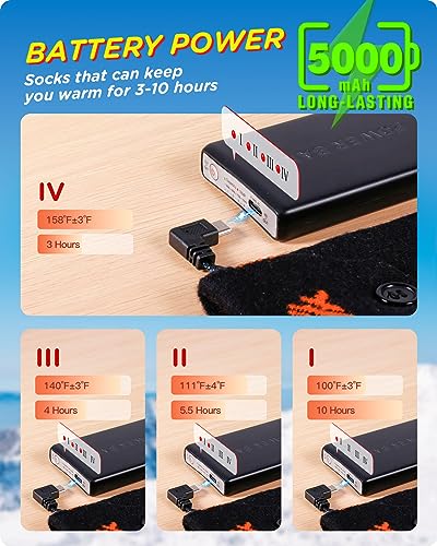 【5000mAh Rechargeable Battery Warm Socks】 The electric socks are equipped with a pair of 5000 mAh large capacity rechargeable batteries, it can provide 10 hours lasting warmth after 3-4 hours fully charged.