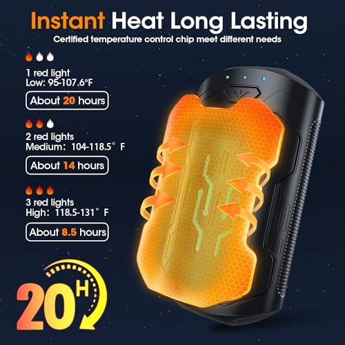 【2s Instant Heat & 3 Heat Levels】 These electric hot pockets hand warmers release heat in just 2 Seconds. Double-sided heat up to 131°F/55°C operating temperature and 3 levels of temperature settings for adjustable and precise stable comfortable warmth.Give you quick relief from the cold and experience the healing power of heat therapy.