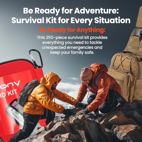 Emergency Survival & First Aid Kit & Tourniquet – 250 PCS Go Bugout Bag Survival Gears with Compass Flashlight Shovel – Tactical Military Grade EDC Backpack for Outdoor Camping Scout