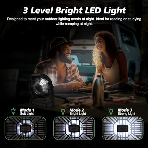 【Light Up Your Night】: This powerful cooling outdoor fan includes a LED light with 3 adjustable brightness settings, catering to your lighting needs during evening gatherings or nocturnal activities. Its versatility as a task light adds value to your nighttime pursuits, whether it’s illuminating a campsite or casting a gentle glow over a page.